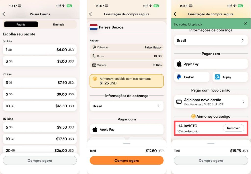 Usando o cupom HAJAVISTO, você ganha 10% de desconto em qualquer compra na Airalo. E esse vale pra todas as vezes, não só na primeira!